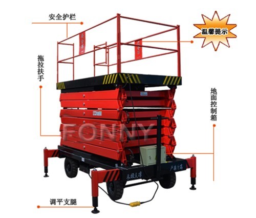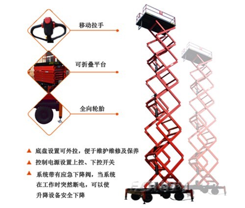 特點:舉升機構采用高強度錳鋼鉅形管制作。設有防止升降機超載的安全保護裝置。設有防止液壓管路破裂的安全保護閥。設有停電情況下的應急下降裝置。該產(chǎn)品適用于各行業(yè)高空設備安裝、檢修等可移動性高空作業(yè)。根據(jù)不同要求可選擇不同動力形式(如:三相交流電源、直流電源),加配上手動液壓裝置,可在停電或無電源場所照常升降工作,并可加伸縮平臺,在平臺長度不足時可延伸至所需位置,從而提高工作效率。是現(xiàn)代高大建筑、設備之理想配備產(chǎn)品,是高空安全文明生產(chǎn)之必備。
