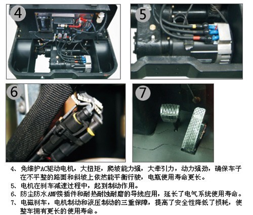 • 免維護AC驅動電機,大扭矩,爬坡能力強,大牽引力,動力強勁,確保車子在不平整的路面和斜坡上依然能平衡行駛,電瓶使用壽命更長。