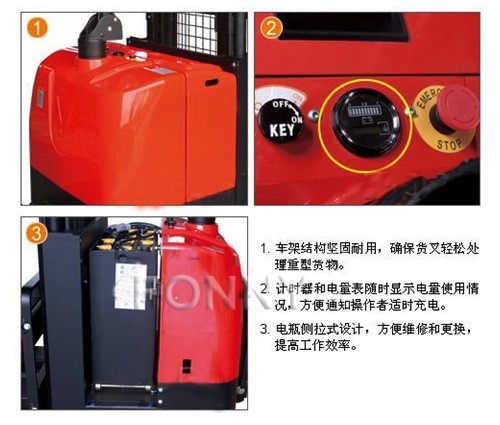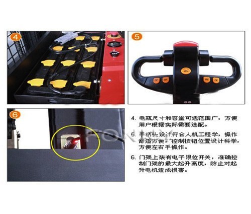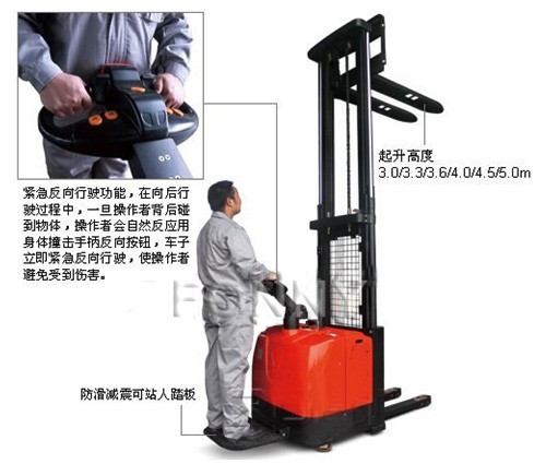 • 緊急反向行駛功能,在向后行駛過(guò)程中,一旦操作者背后碰到物體,操作者會(huì)自然反應(yīng)用身體撞擊手柄反向按鈕,車(chē)子立即緊急反向行駛,使操作者避免受到傷害。