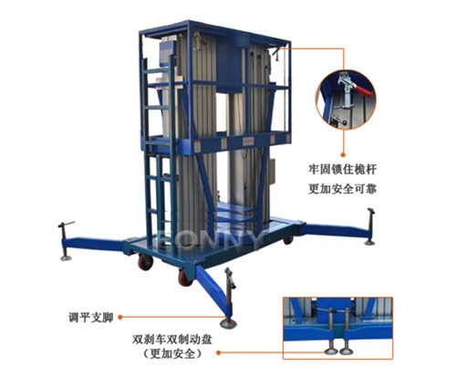 • 兩組桅柱支撐作業平臺同步升降,具有優秀的工作穩定性;整體升降式護欄裝置,強度好;