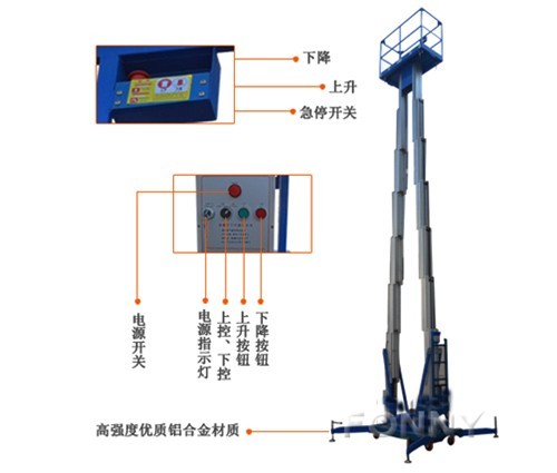 • 電氣發生意外故障時,地面和高空作業人員均可操作急停按鈕使平臺停止升降;