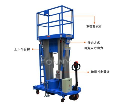 • 平臺控制:平臺上標有操作動作標示圖,易于操作。地面也可控制設備的升降、旋轉;